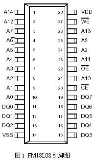 FM18L08引脚结构如图1: /CE:片选 /WE:写使能 /OE:输出使能 A0-A14:地址端 DQ0-DQ7:数据端 VDD:电源 VSS:地